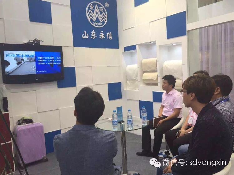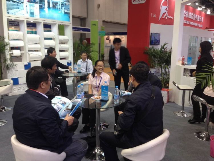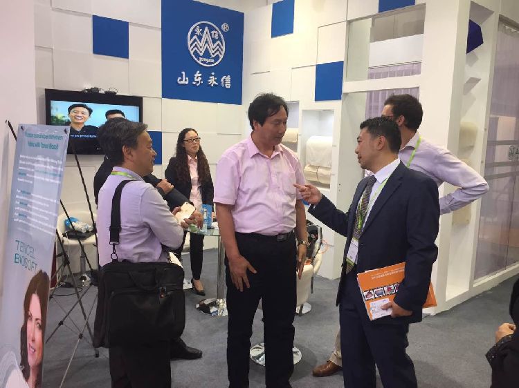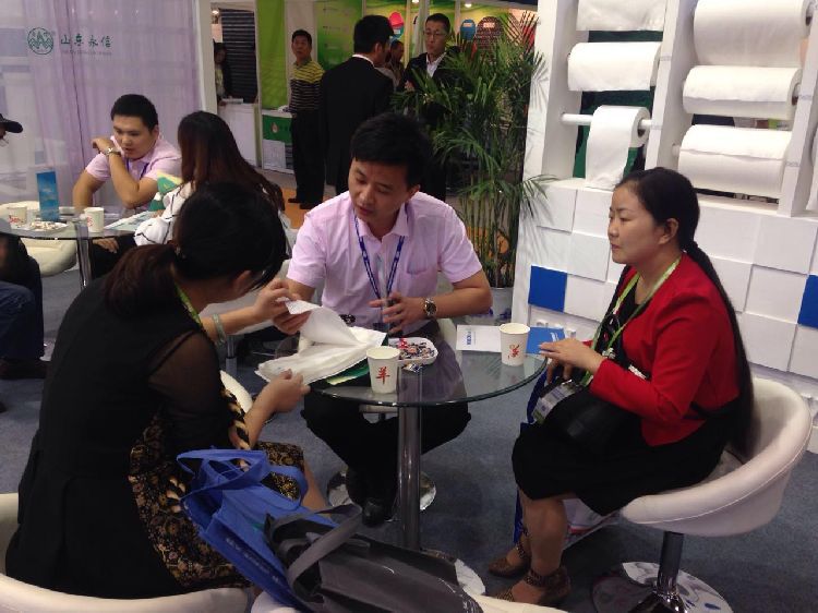 中国国际非织造材料展览会暨高端论坛于2015年10月14日-16日在上海世贸商城展馆举行,山东省永信非制造材料有限公司在董事长和总经理带领营销部、国际贸易部的同志们组成的参展团队参加了此次展会。我们以自搭展台形式独立参展,展区面积达54平米,设立了直铺、交叉和水刺新产品展示区,得到了客户的认可。通过展台创意设计,并在灯光、视频音像等设施的配合下,产品得到了很好的展示;不仅宣传了我司产品、服务理念和企业文化,吸引了众多客商前来我司展台参观沟通洽谈,而且通过业务人员热情周到的接待、耐心细致讲解,每天接待国内外客户百余人次,达成合作意向的就有十余家,有诸多新客户首次接触洽谈,另外,公司新开发的水刺隐形面膜的新产品也得到许多国内外客商的浓厚兴趣,如甲壳素、竹纤维、医用脱脂棉、草珊瑚纤维、薄荷纤维、茯苓纤维、天丝、大豆蛋白纤维和莫代尔等新型功能性纤维开发的水刺无纺布;也有很多客户是带着产品来谈意向合作的。与客户及行业专家交流期间,给了我们在产品研发工作,提出了许多有益的思路和方向,对产品结构的调整和市场的开发提供了很好的参考。