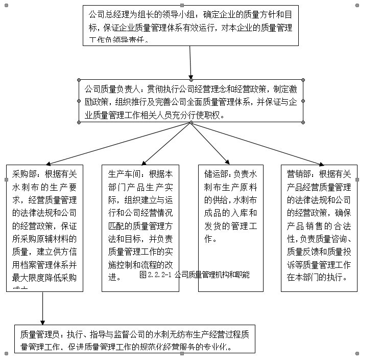 公司的质量管理机构是由公司总经理直接负责质量决策、领导和推进机构,公司具有健全的质量保证体系,明确了质量职责和权限及相关的激励措施等,确保了质量战略的实施。永信非织造材料有限公司的质量管理机构和职能如下图2.2.2-1。