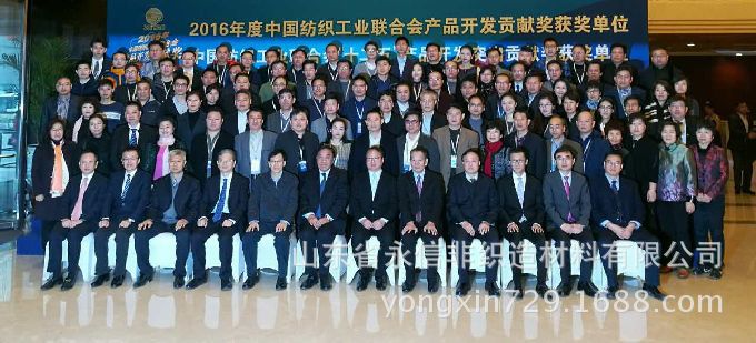 随后,大会举办了中国纺织面料流行趋势研究与发展联盟授牌仪式,颁发了2016年度中国纺织工业联合会可持续纺织产品开发--卓越能效奖、2016年度中国纺织工业联合会产品开发贡献奖/产品开发推动奖,以及中国纺织工业联合会“十二五”产品开发突出贡献奖。 我们永信公司荣获2016年度中国纺织工业联合会产品开发贡献奖,总经理代表董事长上台领取了证书和奖牌。该奖项历经4个月的资格审查、专家初评、专家复评、公示等流程才得以确认。该奖项是以产品创新开发推动企业可持续发展为核心,突出产品开发管理创新对企业开发新产品、优化产品结构的促进作用,倡导以市场需求为导向,注重生态环保、节能降耗、循环经济的产品开发模式,注重资源整合与信息化建设,注重新材料、新工艺、新创意等先进适用技术的产业化应用,提高产品附加值和市场竞争力,推动纺织强国建设。