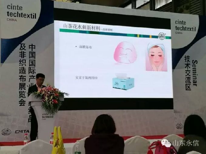 展会期间,公司董事长史成玉受邀出席了由中纺联组织的来自美国、欧洲、印尼、南非及中国香港地区非织造布行业协会圆桌会议,广泛交流了国内外市场信息,董事长发表了公司拓展国内外市场、加快国际化进程的讲话;中国纺织联合会原会长杜钰洲、现任会长孙瑞哲、产业用纺织品协会副会长郑俊林、台湾纺织业拓展会黄伟基秘书长及协会其他领导、专家莅临公司展位,总经理夏伦全详细介绍了公司基本情况及开发生物质纤维水刺新材料和复合整理等功能型新材料,孙会长对公司不断科技创新与产品研发给予了高度评价和期待;副总经理刘双营在“中国国际产业用纺织品及非织造技术交流会”上,作了“生物质山茶花纤维水刺新材料”技术报告,向广大客户推介新产品市场信息。